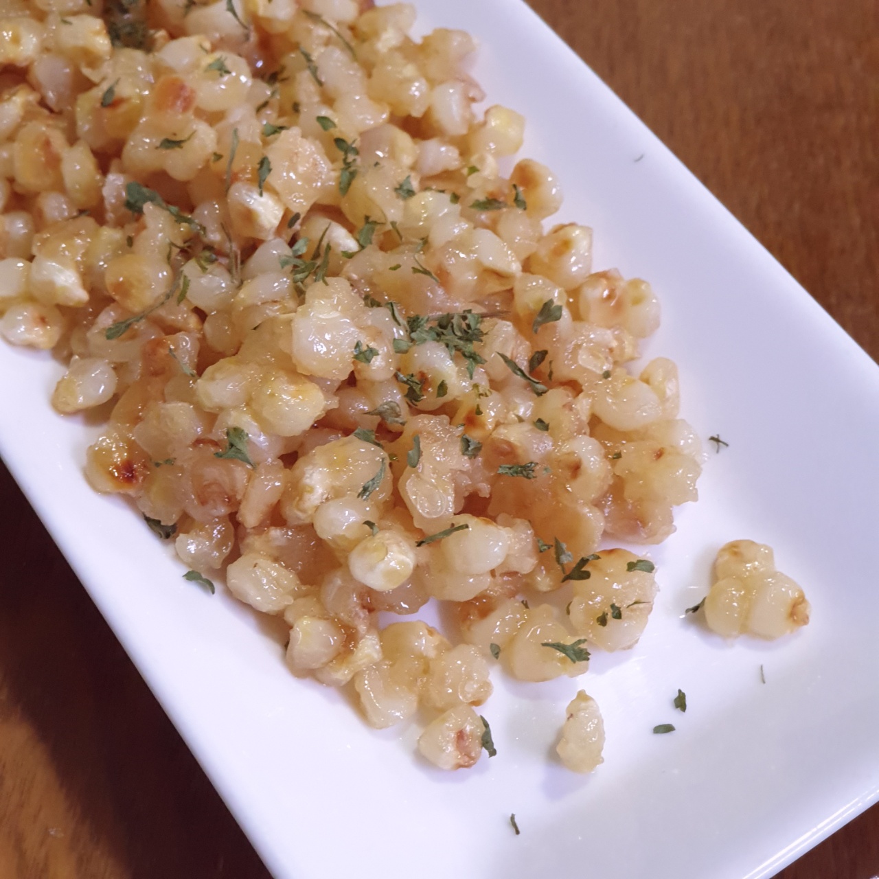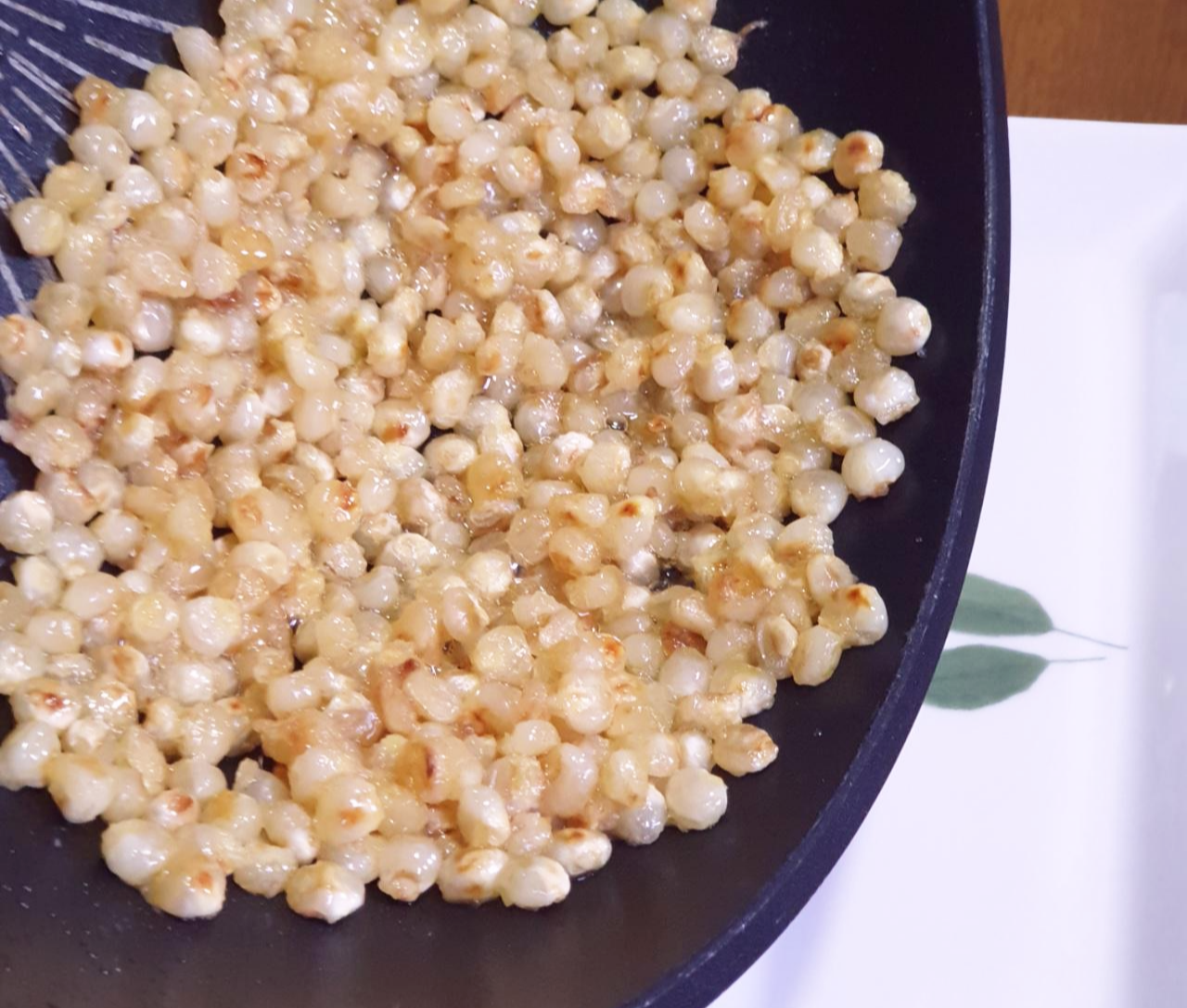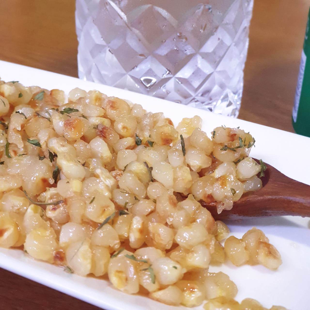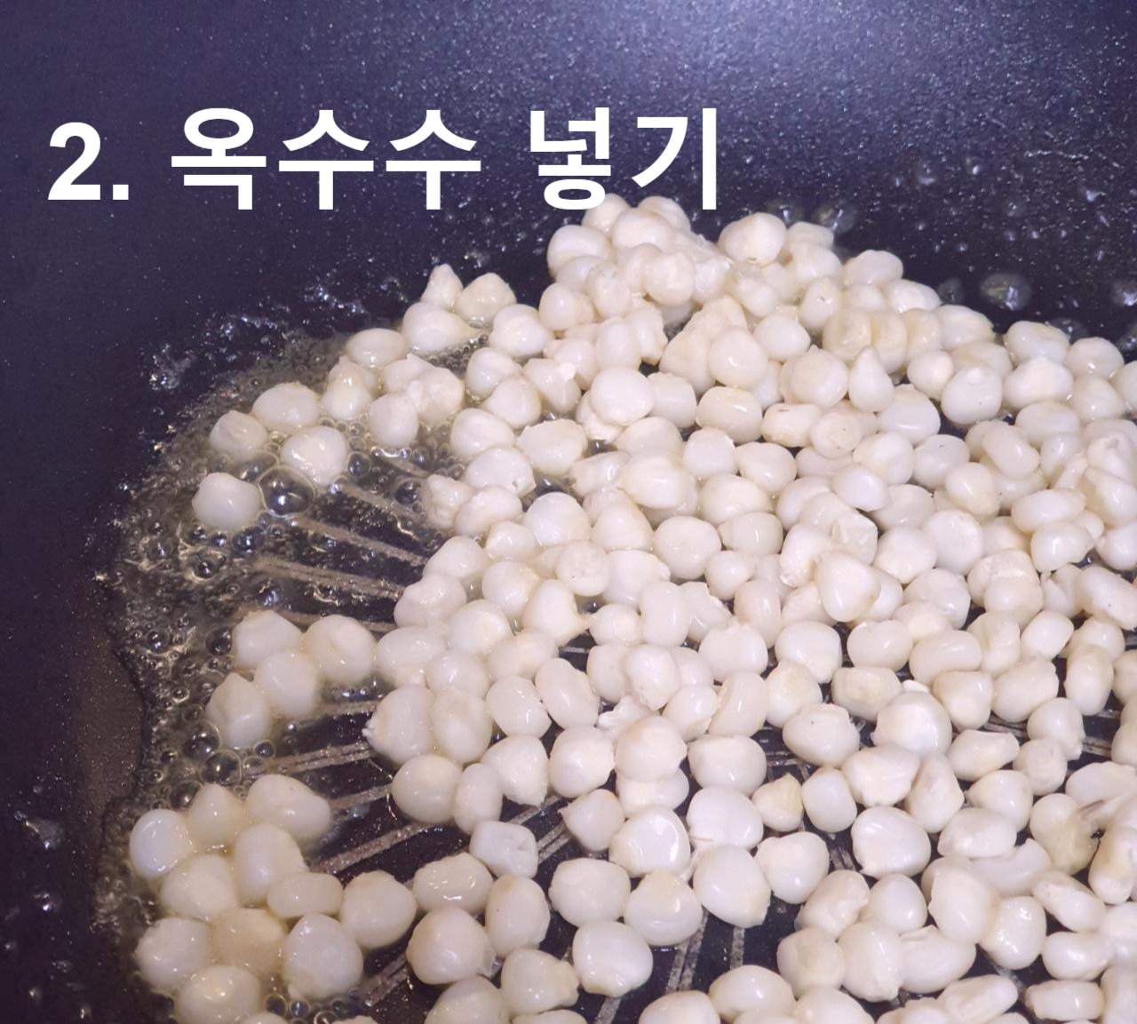 프라이팬에 남아있는 버터에 옥수수 조금