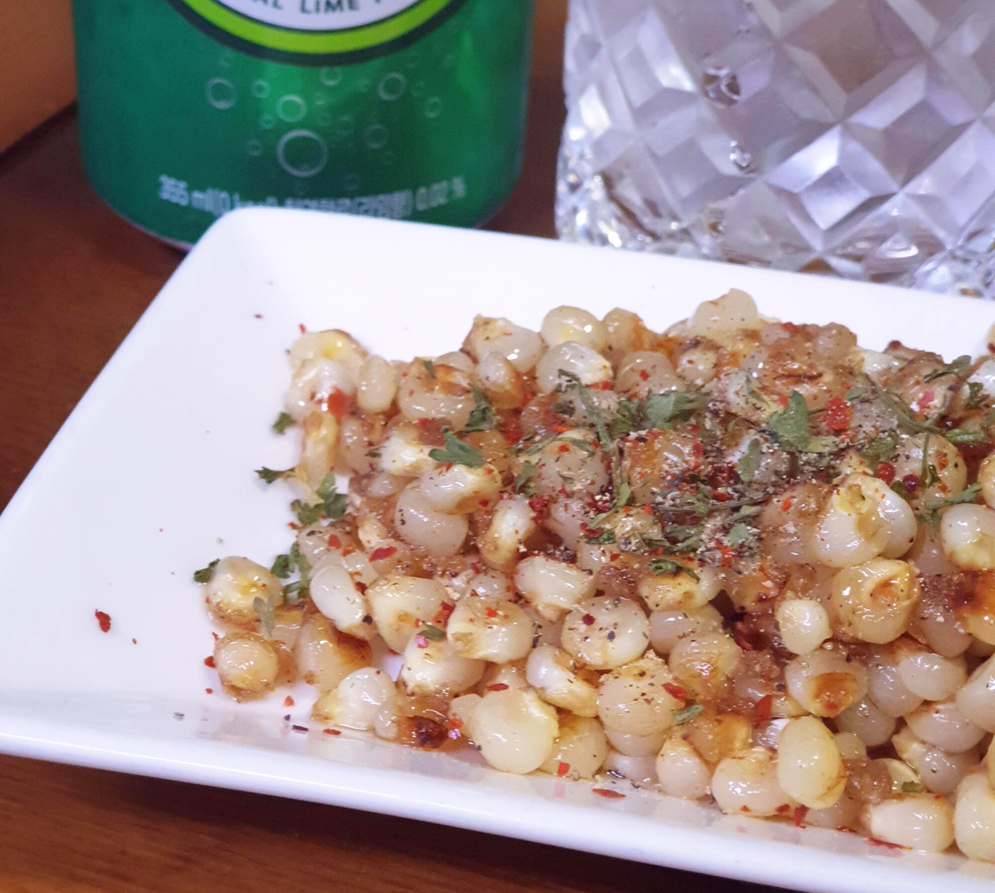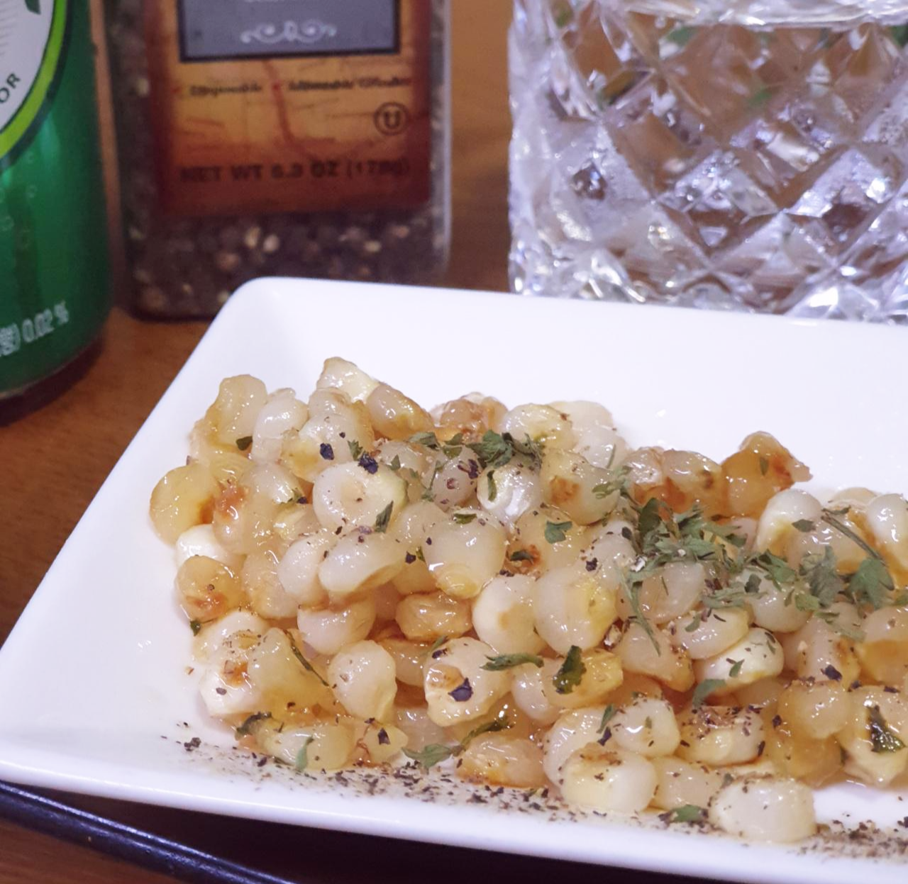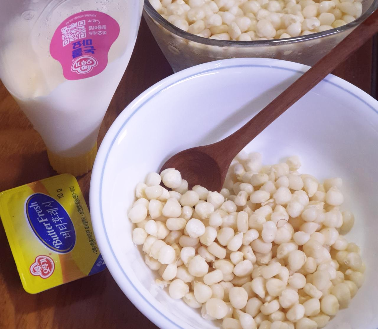 찐 옥수수 알알이, 버터, 마요네즈, 설탕, 소금